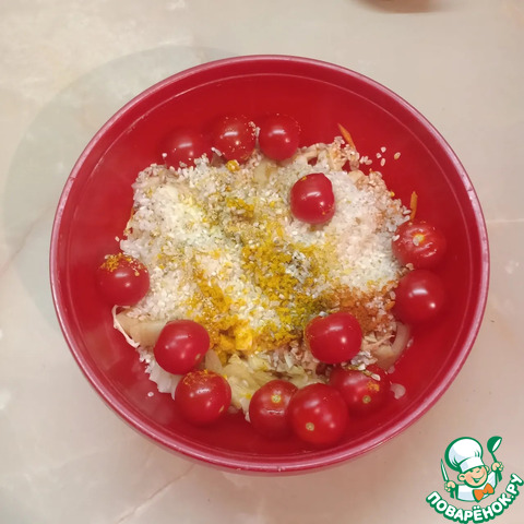 Добавить туда рис, соль, перец, немного куркумы, сладкой паприки, сухого чеснока и растительное масло. В конце добавить разведенную томатную пасту, помидорки и все хорошо перемешать.