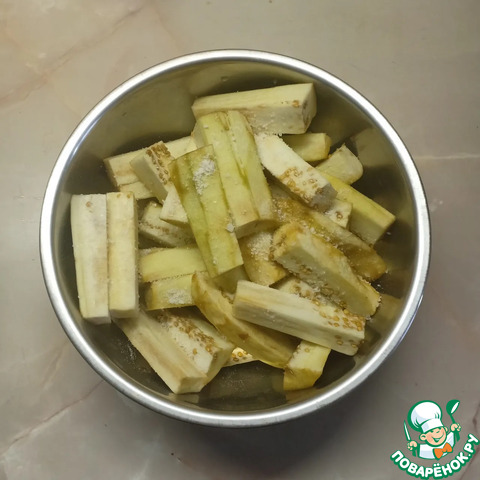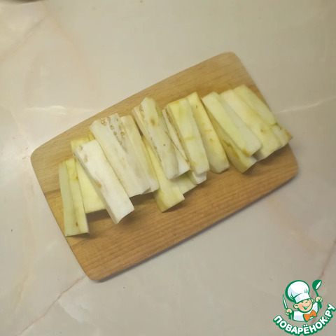 Баклажаны очистить от кожицы и нарезать на длинные брусочки.