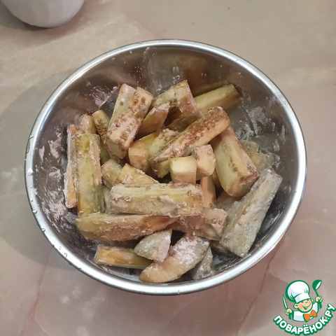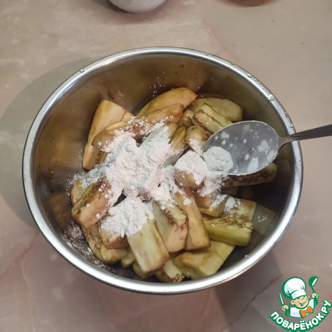 В миску с баклажанами добавить 2ст. л. крахмала и перемешать, чтобы он равномерно распределился по кусочкам.