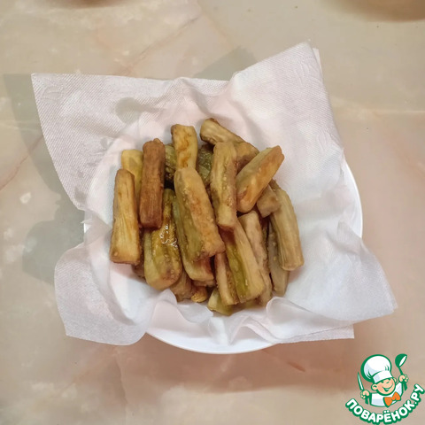 Готовые баклажаны переложить на бумажные полотенца, чтобы впитался лишний жир.