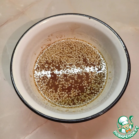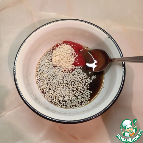 Для соуса смешать в отдельной мисочке 0,5ст. л. крахмала, кетчуп, соевый соус, сахар, уксус, мед, апельсиновый сок и кунжут.