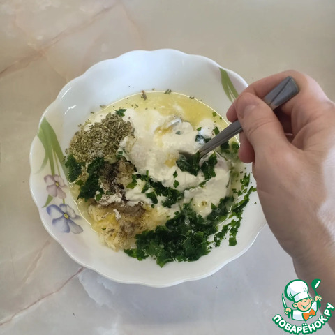 Для соуса в глубокую мисочку выжать лимонный сок, добавить приправы, соль, сметану и измельченные чеснок и петрушку.