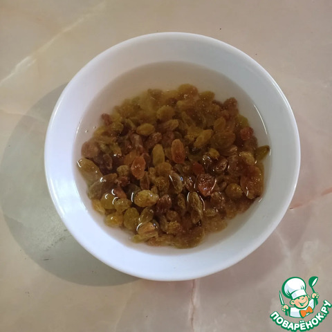 Изюм перебрать, помыть и замочить в горячей воде минут на 10, затем воду слить, а изюм обсушить.