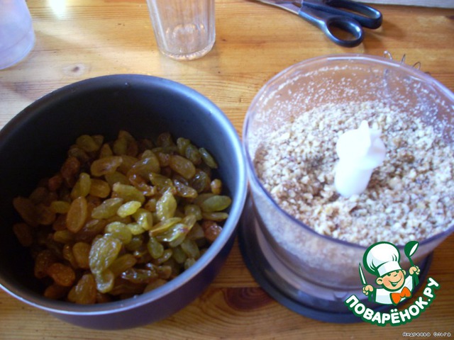 Добавить муку, орехи, изюм. погашенную соду. хорошенько вымесить до консистенции густой сметаны.