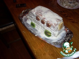 Для торта подготовить крем: взбить сметану с сахарной пудрой.в холодном виде промазать кремом и соорудить то, что подскажет вам ваша фантазия. Поставить в холодильник для пропитки.