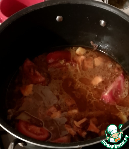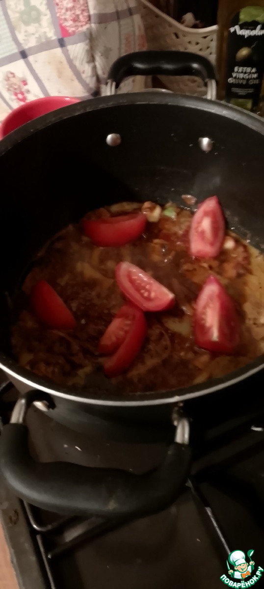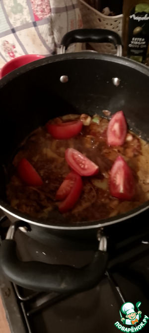 Затем в сковороду введите помидор и 300 мл воды. Продолжайте варить 5 минут..
