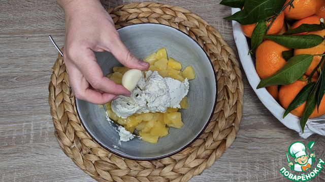 Для начинки: в консервированные ананасы (без сока) добавить творожный сыр, измельчённый чеснок, натёртый сыр и всё хорошо перемешать. Посолить, поперчить немного.