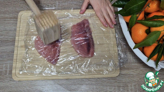 Мясо нарезать на большие кусочки и хорошо отбить.
