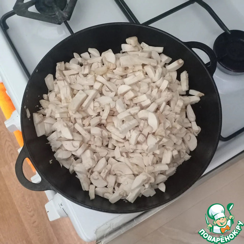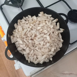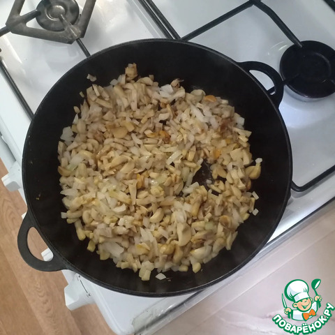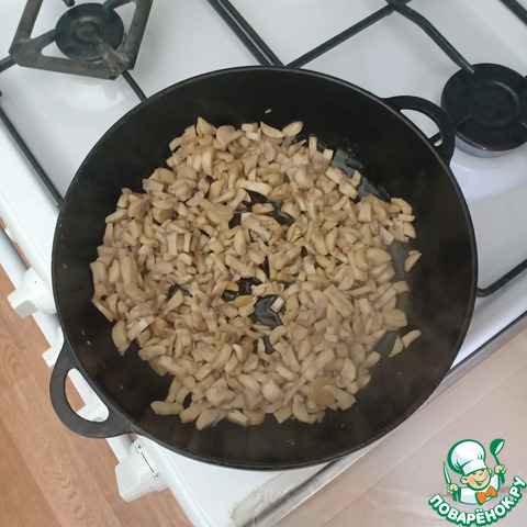 В глубокой сковороде обжарить грибы на растительном масле до тех пор, пока из них не выпарится лишняя жидкость.