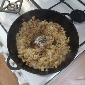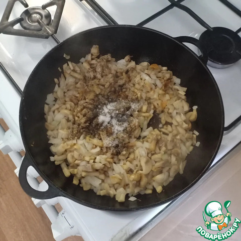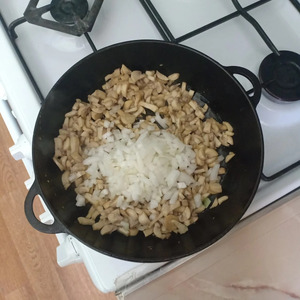 Затем к грибам добавить лук и обжарить все до готовности лука.
