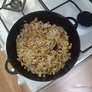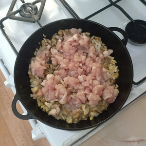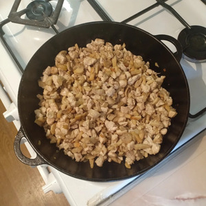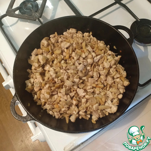 Продолжить обжаривать всю массу до готовности курицы. Остудить.