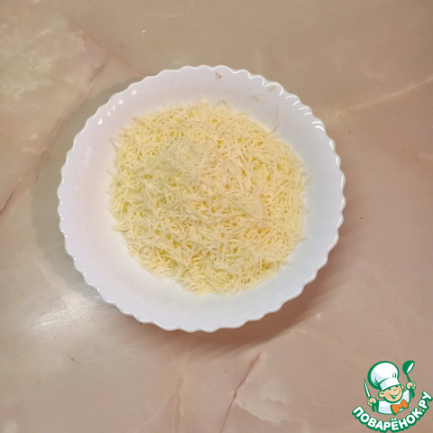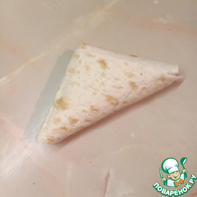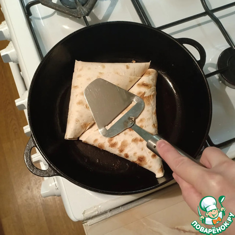 На конец каждой полоски выложить 1-2ст. л. начинки, сверху присыпать тертым сыром и свернуть пирожок треугольничком. Полоску лаваша предварительно можно смазать майонезом или любым другим соусом по вашему вкусу.