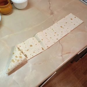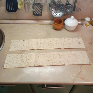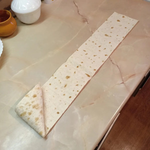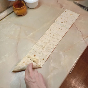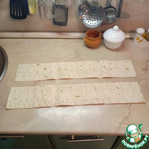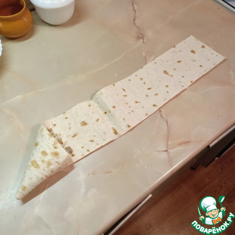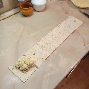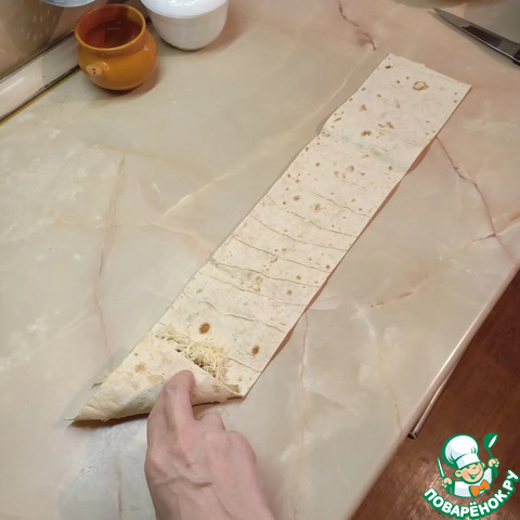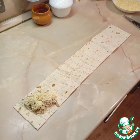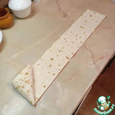 Лаваш разрезать на длинные полосы, шириной 10см и длиной, чтобы можно было свернуть пирожок примерно на 4-5 оборотов.