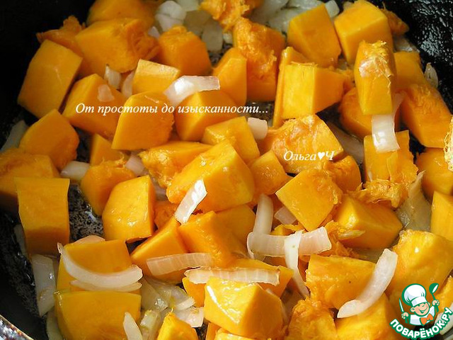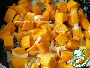 Лук обжарьте на растительном масле, добавьте тыкву, обжарьте вместе 5 минут.