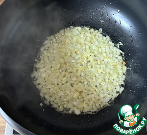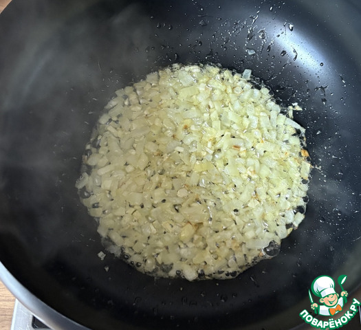 На 30 г сливочного масла и одной ложке растительного потомить лук, добавить чеснок (2 зубчика) и потомить вместе около одной минуты.