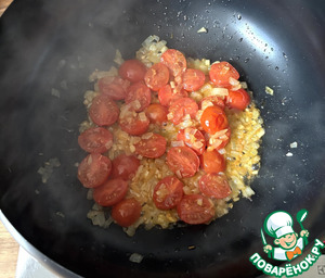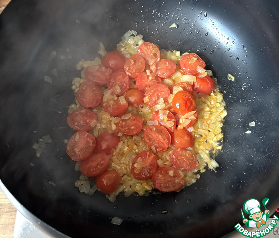 Добавить помидоры черри, нарезанные пополам, потушить их около пяти минут.