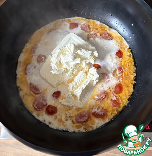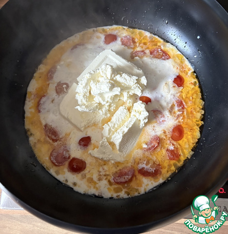 Влить молоко и добавить сливочный сыр, довести до кипения и потушить пару минут.