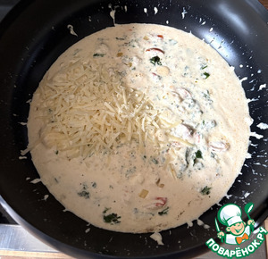 Добавить зелень и натёртый твёрдый сыр, перемешать и отставить сковородку в сторону.