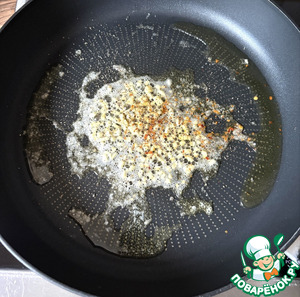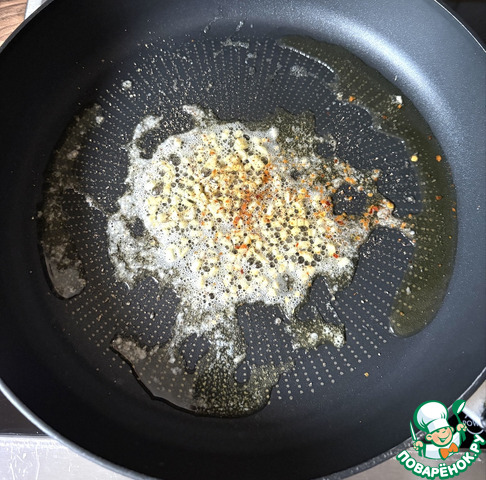 На другой сковородке разогреть 20 г сливочного масла и одну столовую ложку оливкового, обжарить мелко нарезанный чеснок (2 зубчика) до появления аромата, посолить/поперчить немного, по желанию добавить немного острого перца.