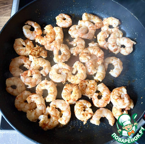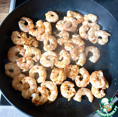 Тут же бросить креветки на сковородку и обжарить их 1-2 минуты, НЕ БОЛЬШЕ!