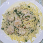 Первым делом поставить варить пасту, так как на приготовление соуса не требуется и полчаса. Готовить можно как с креветками, так и с кальмаром или другими морепродуктами. Если креветки замороженные - разморозить и обмакнуть насухо бумажными салфетками, это не даст выделиться жидкости и креветки не будут резиновые.