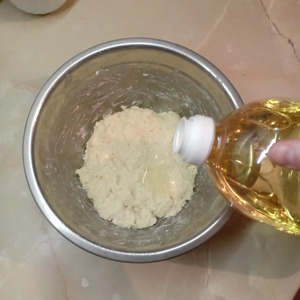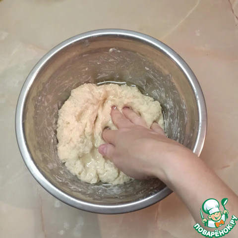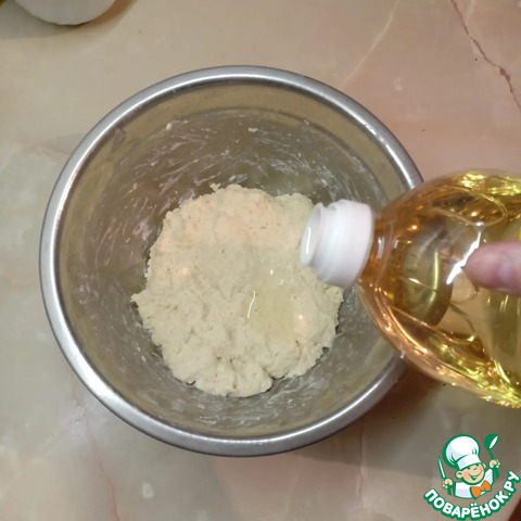 Получившуюся массу вымесить руками, постепенно вводя растительное масло. Именно оно даст тесту необходимую эластичность.