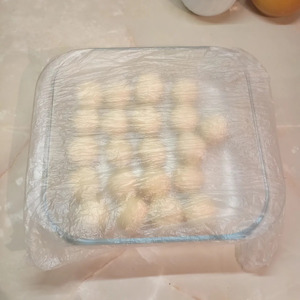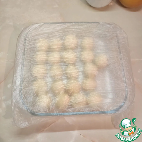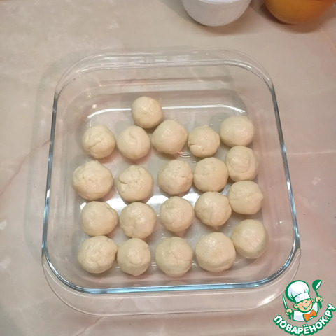 После этого разделить тесто на 10-12 равных частей и каждый кусочек скатать в шарик (вначале я сделала шарики меньше, но в итоге пришлось их объединять, т. к. лепешки получились маленькие и неудобно было заворачивать блинчик). При скатывании шариков смажьте руки маслом, чтобы тесто не липло к рукам. Приготовленные шарики сложить в посуду, залив их одной ложкой растительного масла.