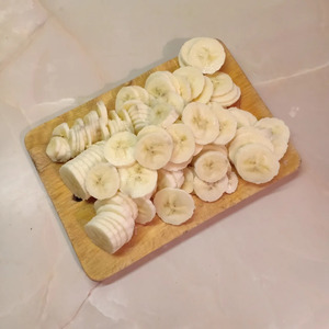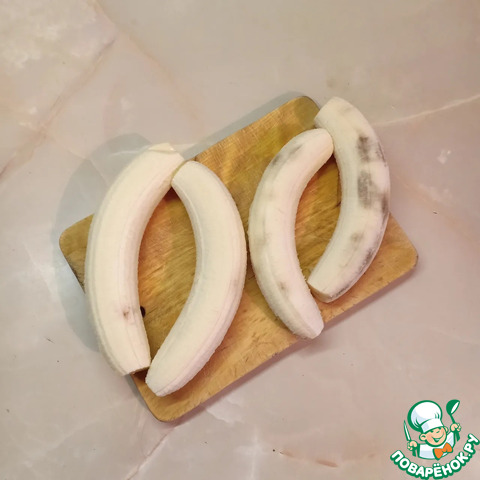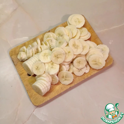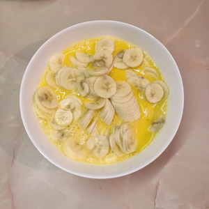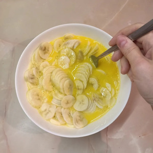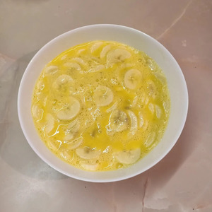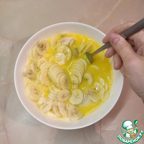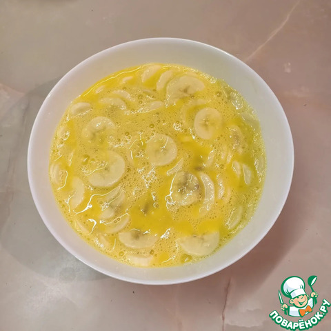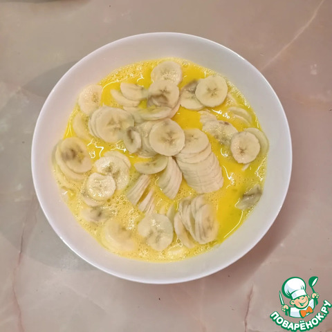 В миску к взбитым яйцам выложить нарезанные бананы.