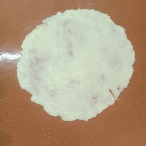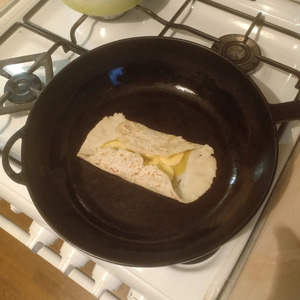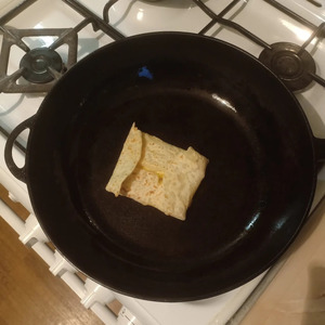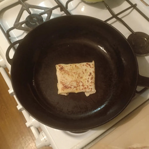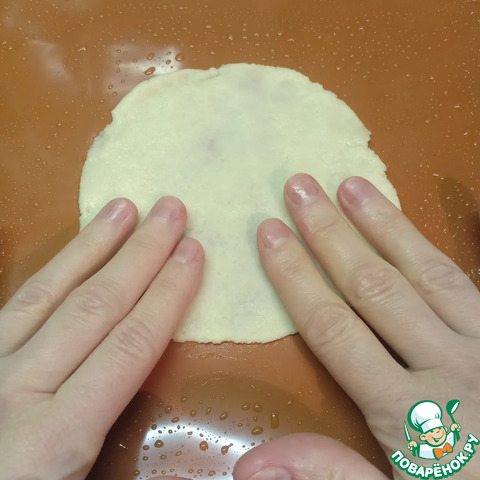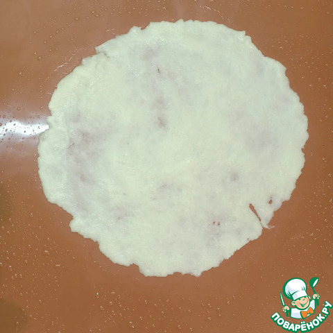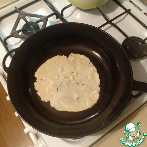Раскатанную лепешку аккуратно поместить на раскаленную сковороду, слегка смазанную растительным маслом и дать ей «схватиться» в течение 10-15сек.