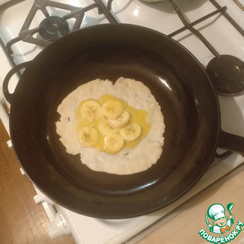 Затем в середину блинчика налить немного яично-банановой смеси.