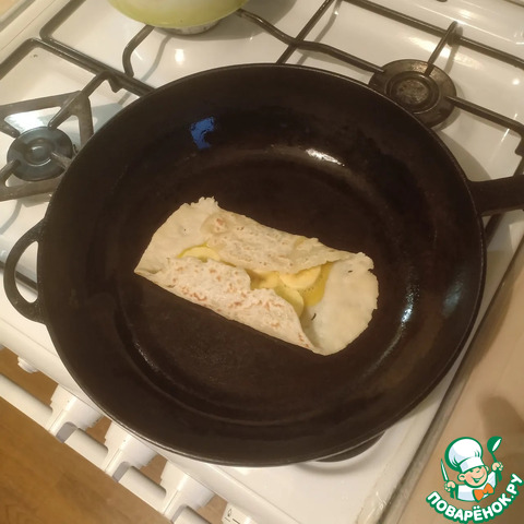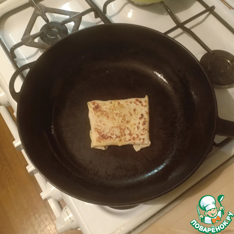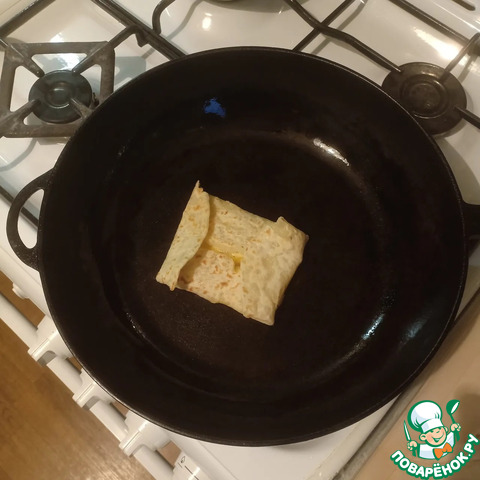 Завернуть блинчик конвертиком и обжарить с другой стороны до золотистой корочки. Если вам нравятся блинчики «посочнее», то добавьте в начинку кусочек замороженного сливочного масла.