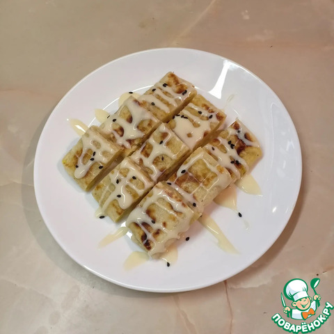 Готовый блинчик выложить на тарелку, разрезать на порционные кусочки и полить сверху сгущенкой или растопленным шоколадом.