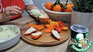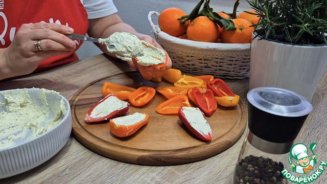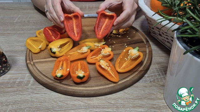 Перчики разрезать пополам и вынуть всё, что в нутри, все семечки и перегородки.