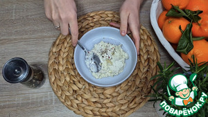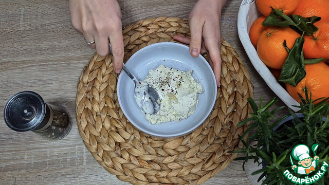 В творожный сыр добавляем измельчённый чеснок и чёрный перец. Можно ещё добавить какую-то зелень:петрушку, укроп, зеленый лук. И хорошо всё перемешиваем.