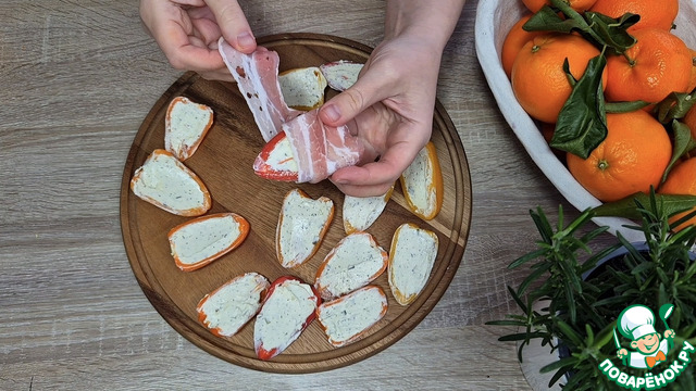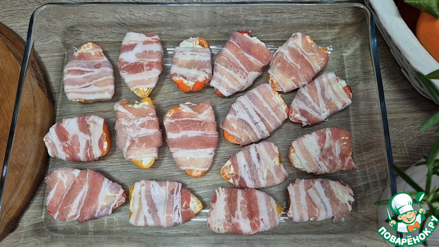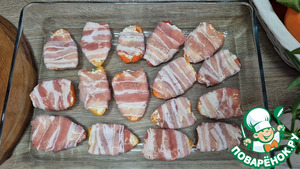И заворачиваем в полосочку бекона. Бекона не жалейте, при запекании он может сползти, если будет мало.