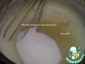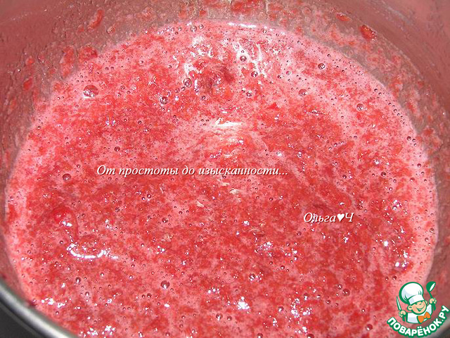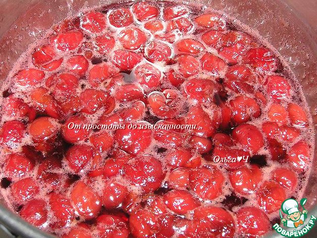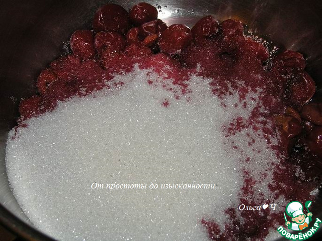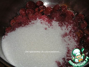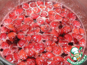 Для вишневой прослойки смешайте вишню, сахар (100 г), доведите до кипения, варите 2 минуты, снимите с огня.