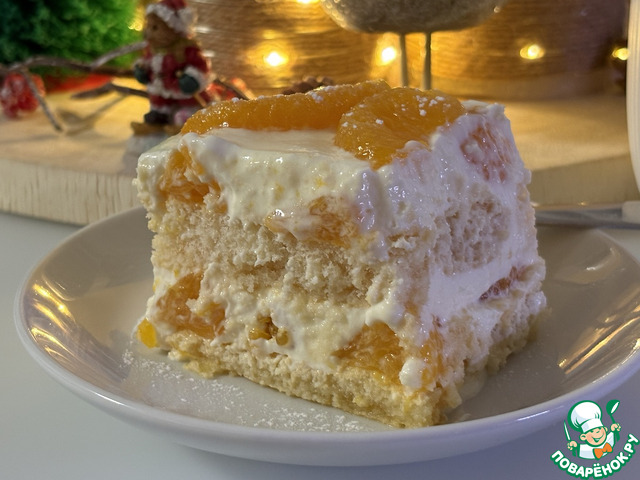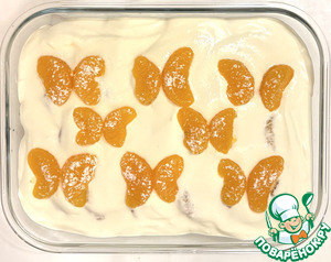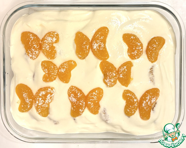 Для украшения я открыла ещё одну баночку мандаринов и разложила их бабочками. При подаче посыпать сахарной пудрой.
