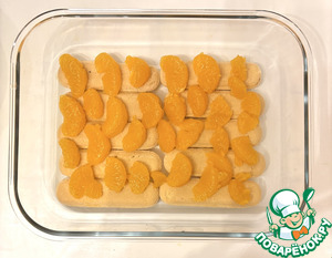 Выложить печенье в форму. Слить сироп с мандаринов, разложить их на печенье.