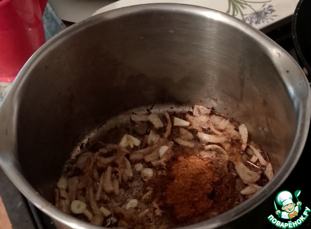 В казане на том же масле обжаривать лук, зиру и корицу 10 минут, регулярно помешивая. Добавить перец красный жгучий, чеснок, соль, имбирь, порошок карри. Готовить 2 минуты до ароматности.