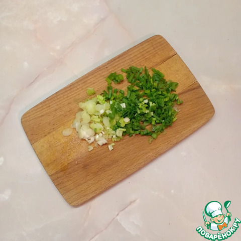 Перья зелёного лука вымыть, обсушить и мелко нарезать.