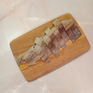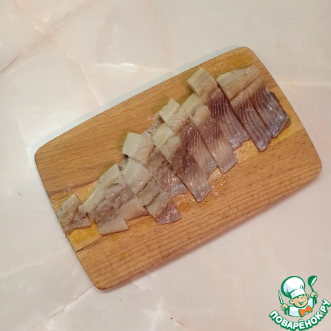 Филе сельди нарезать на кусочки шириной 1-1,5см.
