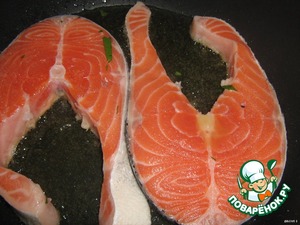 Свежий стейк саломона, промываем, высушиваем полотенцем, чуть присоливаем - и на сковородку в горячее оливковое масло. Жарим до румяной корочки.