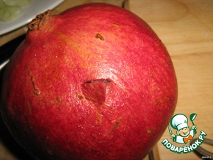 Пока сейки жарятся. Нужно размять спелый гранат. Просто берем его и начинаем мять, но аккуратно, чтобы не повредить корочку.
