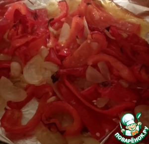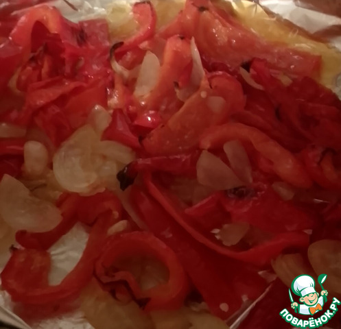 Разогреть духовку до 200С. В отдельной ёмкости смешать перцы, лук, 5 столовых ложек оливкового масла и половину чайной ложки соли.
