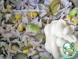 Добавьте нарезанные кусочками авокадо и огурцы, всыпьте кукурузу, перемешайте.