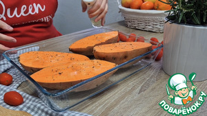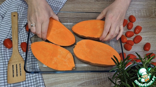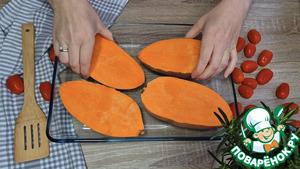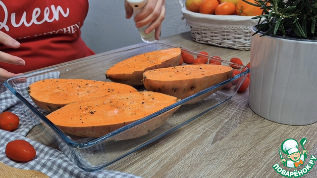Батат помыть, разрезать пополам и выложить в форму для выпечки.