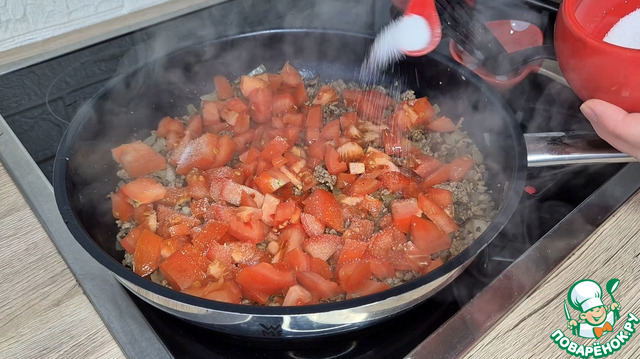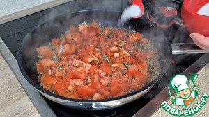 Затем нарезанные помидоры, копчёная Паприка, соль и чёрный перец.