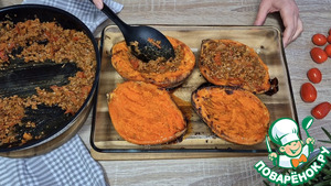 Фарш с овощами выкладываем в половинки батата