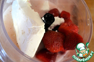 В чашу блендера поместить овсяное молоко, творог и клубнику.