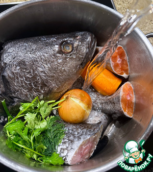 Потом все рыбное закладываем в кастрюлю, ёмкость оной сами прикиньте – в зависимости от количества запасов. Залить водой чистой. Я обычно на килограмм рыбного сырья беру полтора литра воды. Но! Это чисто мой подход к бульону.